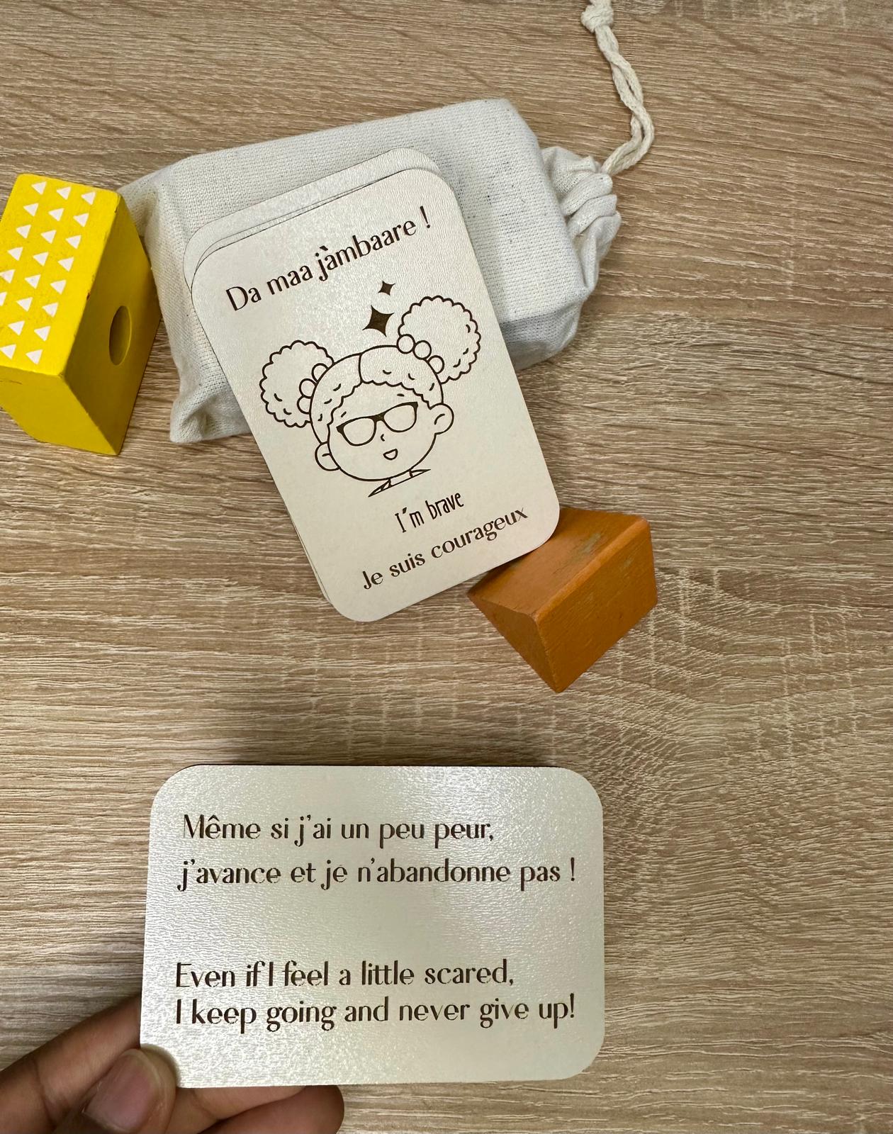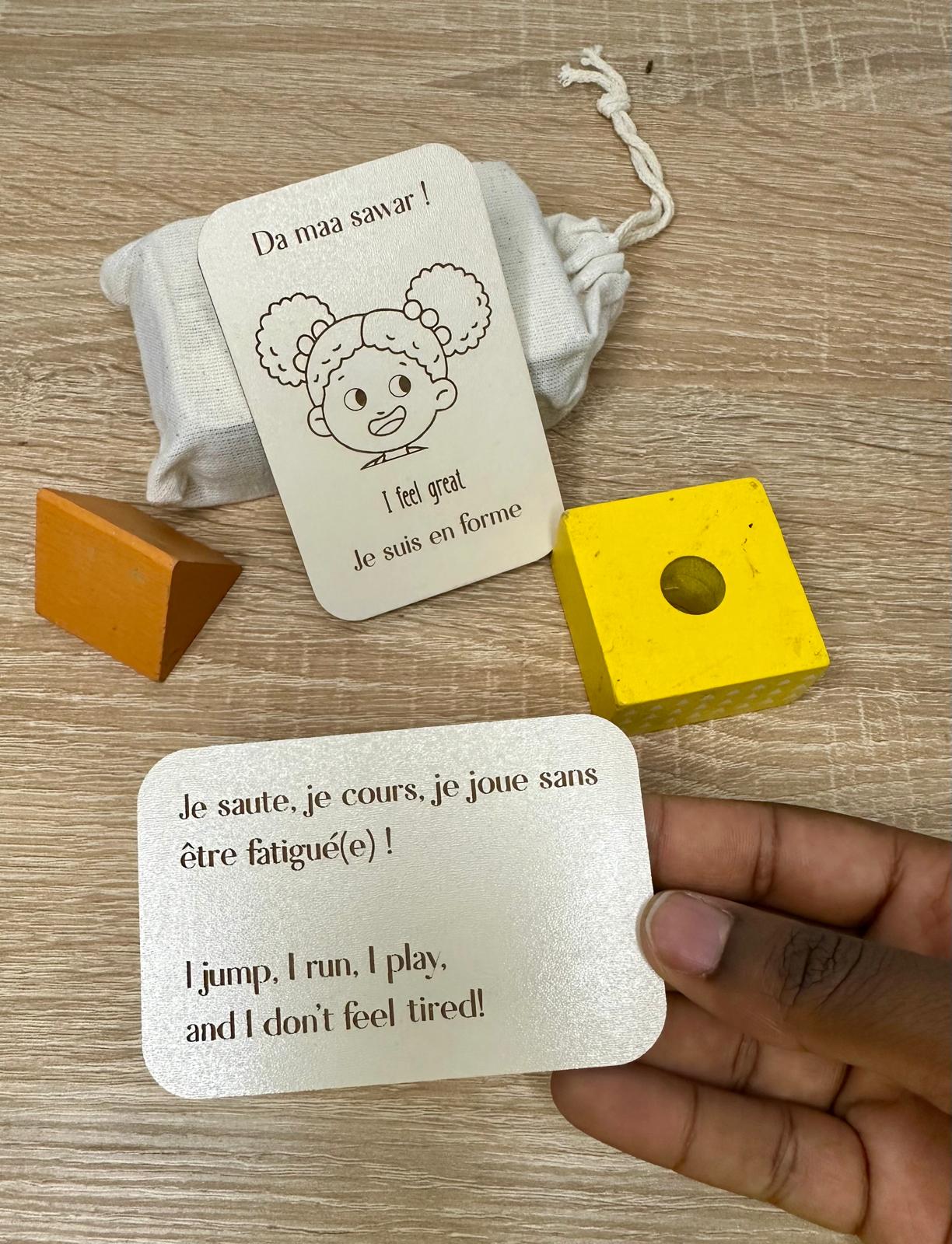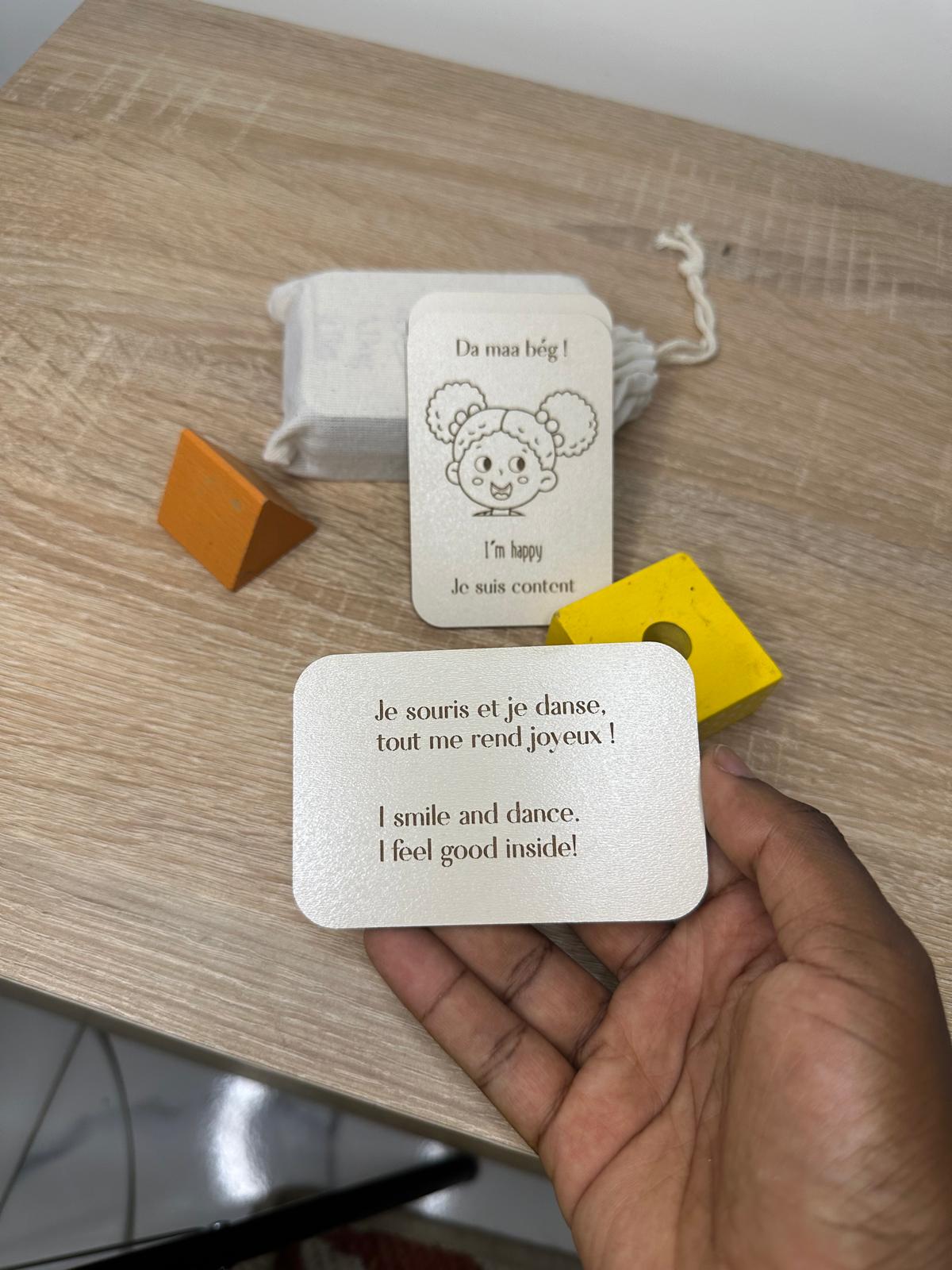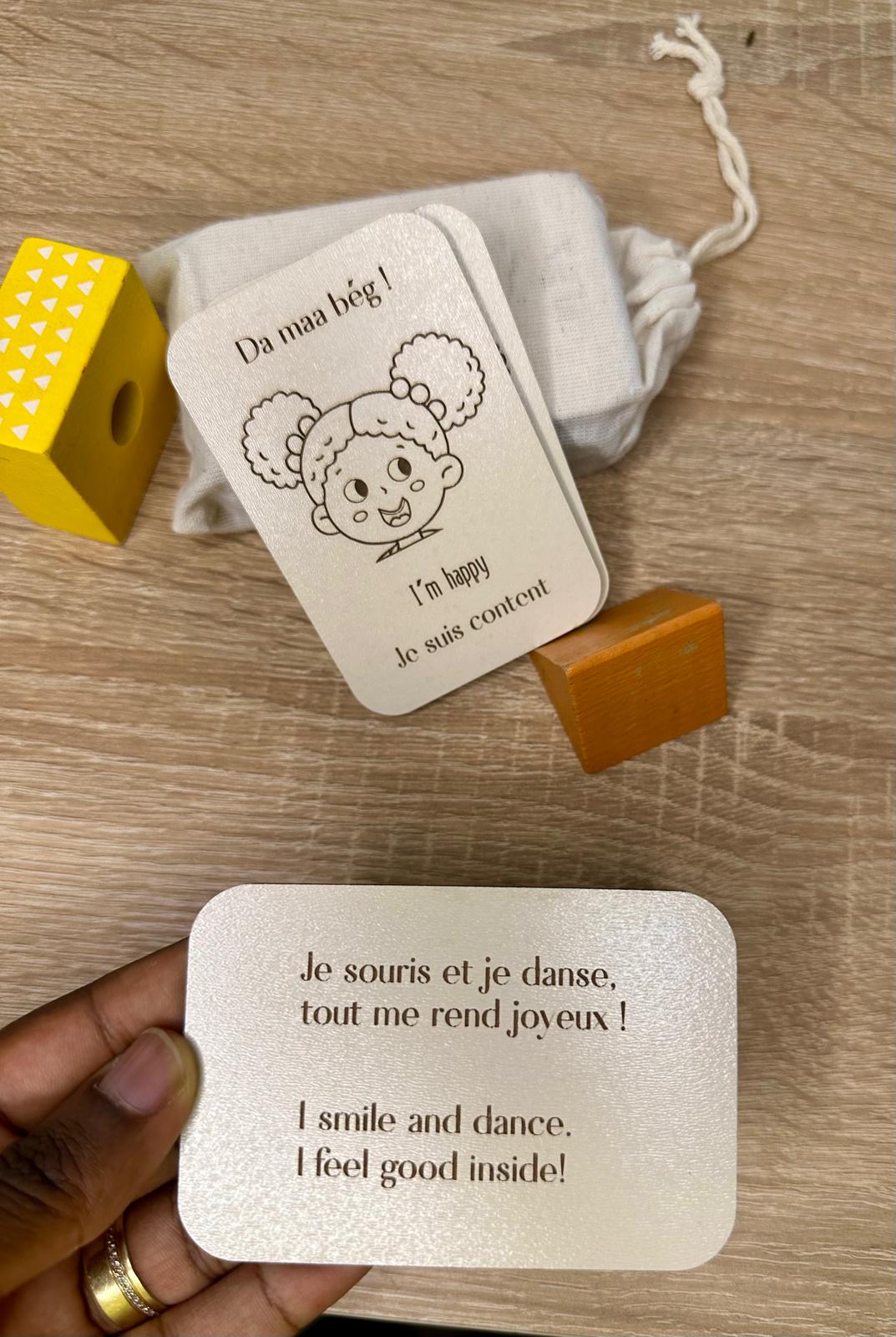 Chaque carte représente une émotion ou un état courant de l’enfant, en français, anglais et wolof, pour l’aider à mettre des mots sur ce qu’il ressent dans toutes les langues de son quotidien.